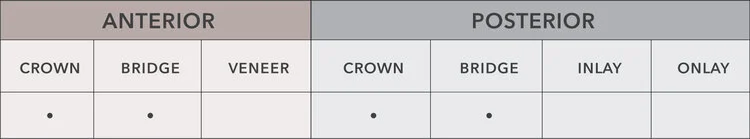 Porcelain fused to metal can be used for single and posterior single-unit crowns and bridges, and can be designed to fit any type of preparation as well. PFM restorations are also indicated for crowns and bridges used in combination with cast partials. Porcelain can be fused to non-precious, semi-precious or white high noble copings.